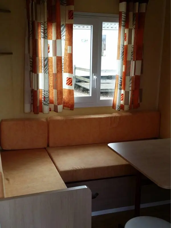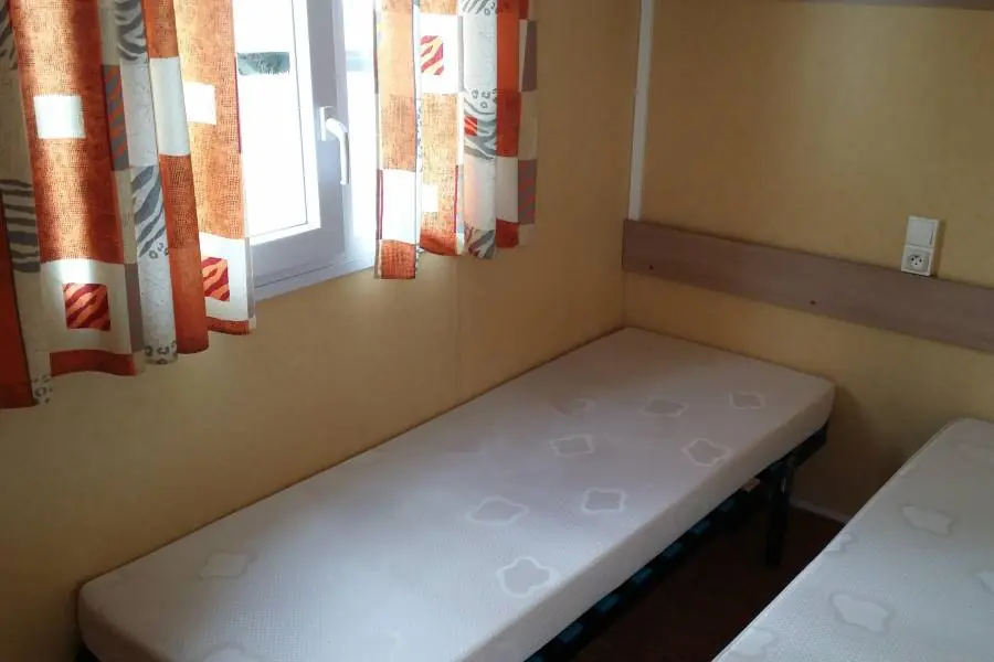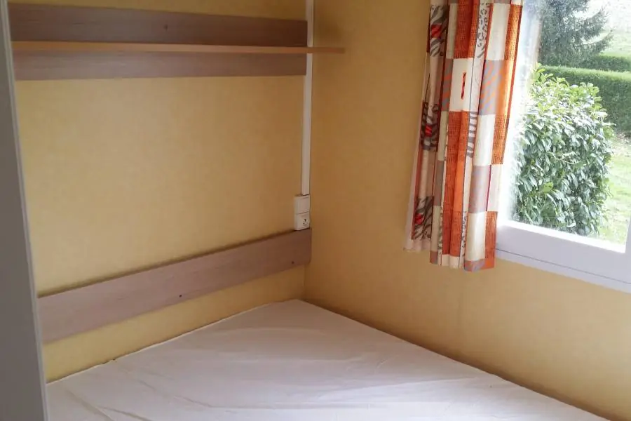 Mobil-home Eco Nature sans sanitaires -2 chambres (1 avec lit 140 x 190 et la 2ème 2 lits côte à côte 80 x 190), salon, cuisine équipée (gaz, frigo, micro-ondes, vaisselle). Belle terrasse extérieure non couverte avec salon de jardin.